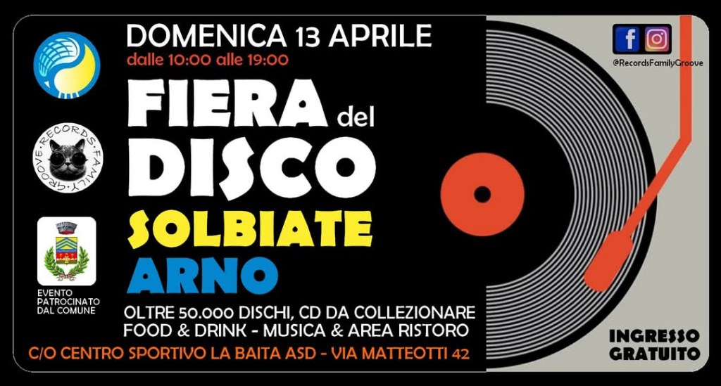 SOLBIATE ARNO – Amanti del vinile, collezionisti e semplici curiosi: segnatevi la data! Domenica 13 aprile il Centro Sportivo La Baita di Solbiate Arno ospita la prima edizione della Fiera del Disco, un evento culturale organizzato da Records Family Groove e patrocinato dal Comune e interamente dedicato al mondo della musica su supporto fisico.
