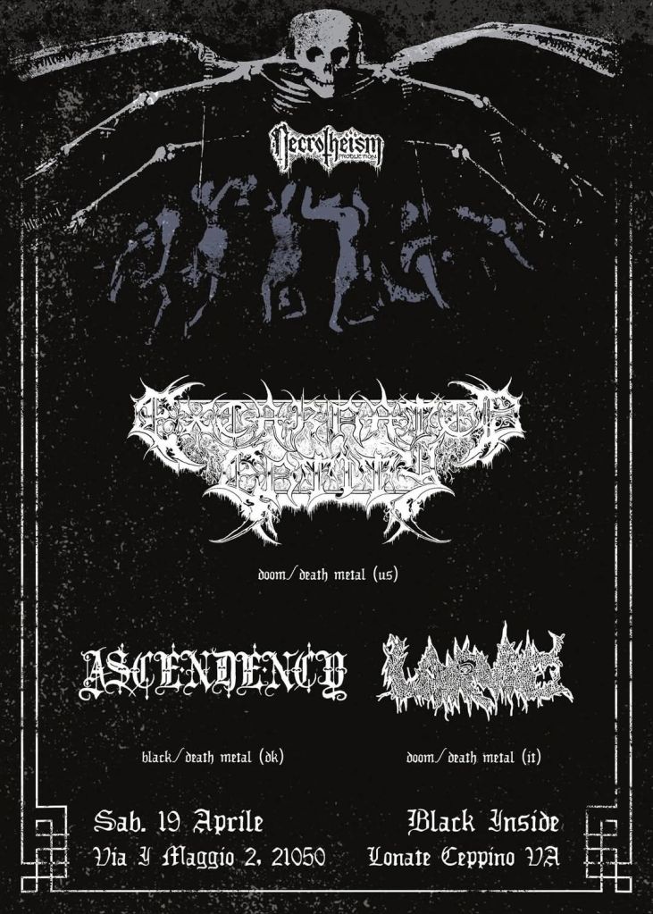 LONATE CEPPINO – Il 19 aprile 2025 la Pasqua si tinge di nero: il palco del Black Inside di Lonate Ceppino (VA) ospita una serata imperdibile per gli amanti del metal estremo. NECROTHEISM PROD presenta infatti Excarnated Entity (USA) e Ascendency (Danimarca) per un appuntamento che promette di essere un absurde rituale, come recita il titolo del tour.