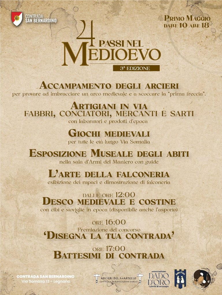 LEGNANO – Una giornata tra medioevo, cibo e divertimento per tutta la famiglia: mercoledì 1° maggio 2025, dalle 10:00 alle 18:00, la Contrada San Bernardino apre le porte del suo maniero per un evento imperdibile!