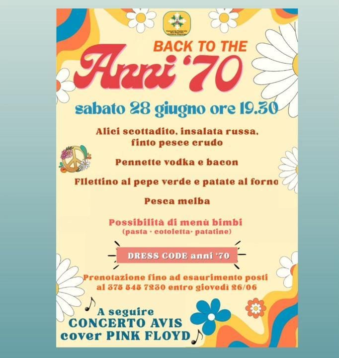 Cena Back to the Anni ’70 prenotazione fino ad esaurimento posti entro giovedì 26 giugno, chiamando il 3755457230 oppure scrivendo un messaggio sulla pagina Instagram e Facebook della Comunità pastorale San Maurizio.