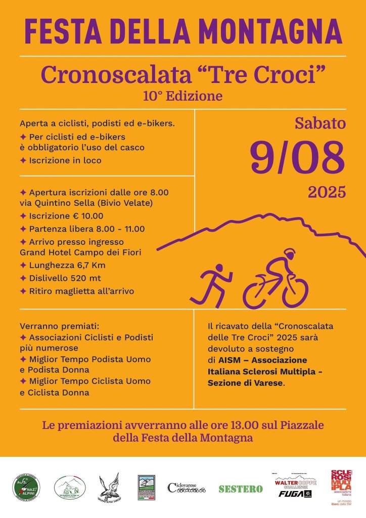 CAMPO DEI FIORI – La Cronoscalata Tre Croci torna per la decima edizione e lo fa in grande stile, nell’ambito della Festa della Montagna. La gara è aperta a ciclisti, podisti ed e-bikers (casco obbligatorio per chi è su due ruote).