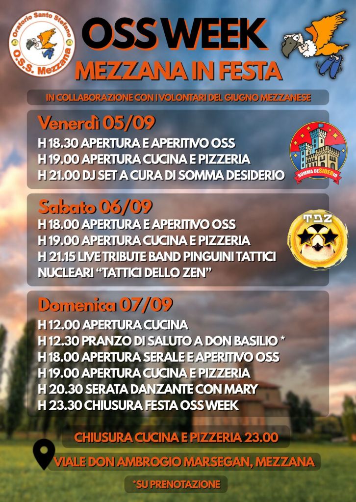 MEZZANA – A Mezzana si respira aria di festa: dal 5 al 7 settembre 2025 torna la OSS Week – Mezzana in Festa, tre giorni di musica, buon cibo, allegria e comunità, organizzati dall’Oratorio Santo Stefano in collaborazione con i volontari del Giugno Mezzanese. Una manifestazione che negli anni è diventata uno dei momenti più attesi dal paese e che quest’anno propone un programma ricco di appuntamenti per tutte le età.