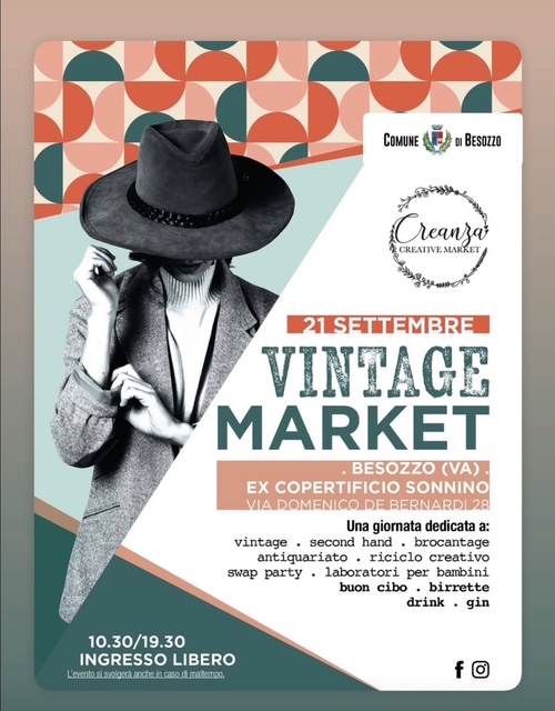 BESOZZO – Domenica 21 settembre 2025, l’ex Copertificio Sonnino di Besozzo (VA), in via Domenico De Bernardi 28, si trasforma in un grande contenitore di creatività e atmosfere retrò con il Vintage Market organizzato da Creanza Creative Market.