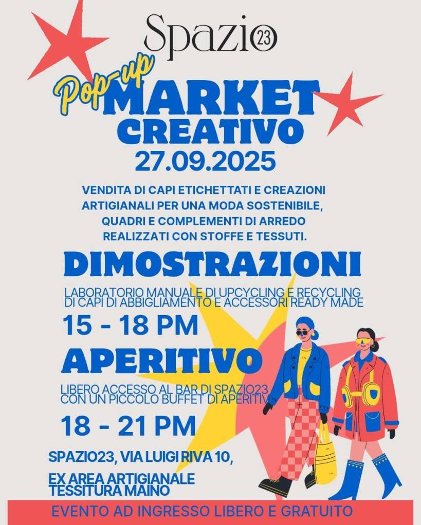 GALLARATE – Sabato 27 settembre 2025 Spazio23 si trasforma in un laboratorio di creatività sostenibile con il Pop-up Market Creativo, un appuntamento aperto a tutti (ingresso libero e gratuito) nell’ex area artigianale della Tessitura Maino, in via Luigi Riva 10.