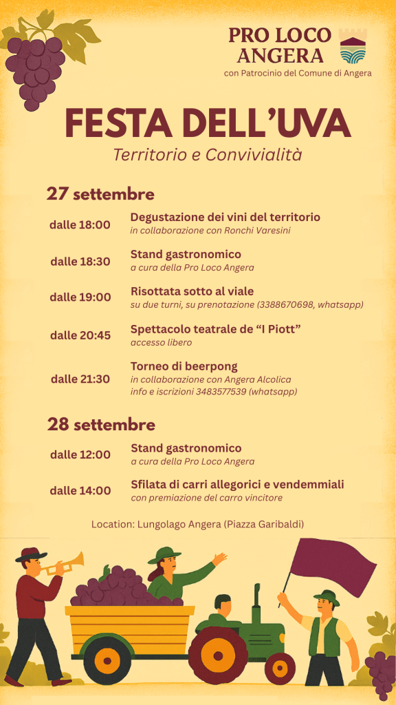 ANGERA – Il 27 e 28 settembre 2025 torna uno degli appuntamenti più amati del territorio, organizzato dalla Pro Loco di Angera con il patrocinio del Comune: la Festa dell’Uva, due giorni di gusto, musica, spettacoli e tradizione sulle rive del Lago Maggiore.