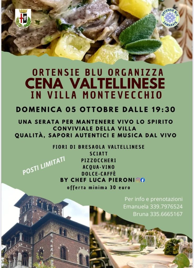 SAMARATE – Se volete vivere una serata speciale, all’insegna dei sapori autentici e dello spirito conviviale che ogni anno riempie di vita Villa Montevecchio, segnatevi questa data. L’associazione Ortensie Blu vi aspetta con la tradizionale grande cena pubblica, accompagnata da musica dal vivo e da tutta la cura che i volontari sammaratesi sanno mettere nei dettagli: segnaposti verdi, stoviglie firmate Tonetti House, fiori freschi e tanto cuore. 💚