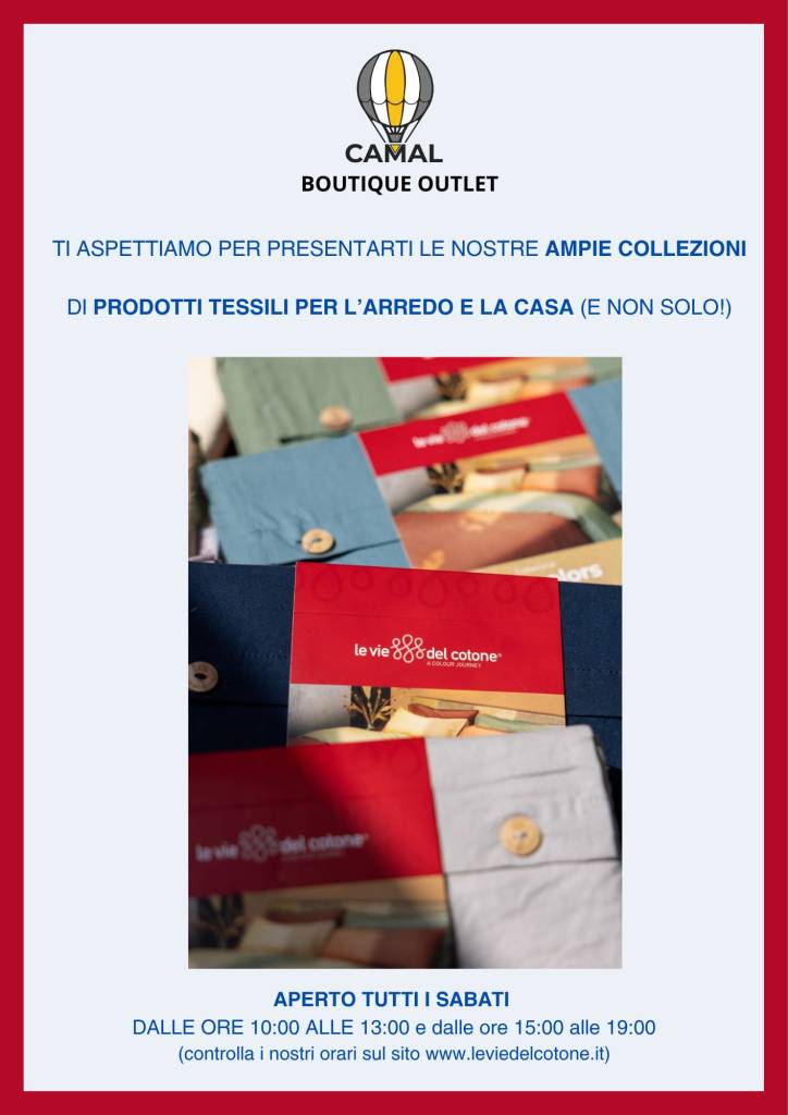 GALLARATE – A Gallarate il legame tra cultura e impresa continua a tessere nuove trame. Dopo la serata al MA*GA dedicata al Patto per le Arti, il progetto che unisce aziende e istituzioni per sostenere la cultura locale, arriva una notizia più “a portata di mano”: domani, venerdì 11 ottobre, apre il Boutique Outlet di Camal – Le Vie del Cotone in via Andrea Costa 20.