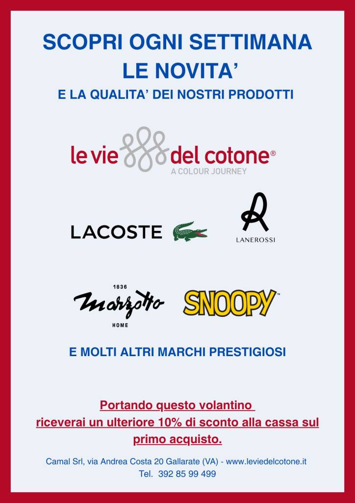 L’azienda, una delle realtà coinvolte nel Patto, inaugura il nuovo spazio con una giornata dedicata ai prodotti tessili per la casa e l’arredo. In vetrina marchi noti come Lacoste, Lanerossi, Marzotto e Snoopy, insieme alle collezioni firmate Le Vie del Cotone.