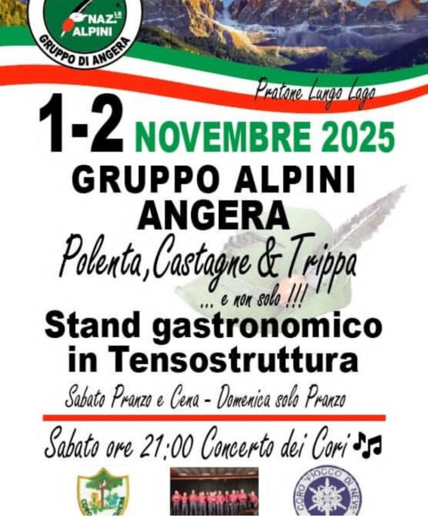 ANGERA – Il primo weekend di novembre profuma di polenta, castagne e trippa: il Gruppo Alpini di Angera invita tutti a due giornate di festa e gusto nella tensostruttura sul lungo lago. 🌰🍂