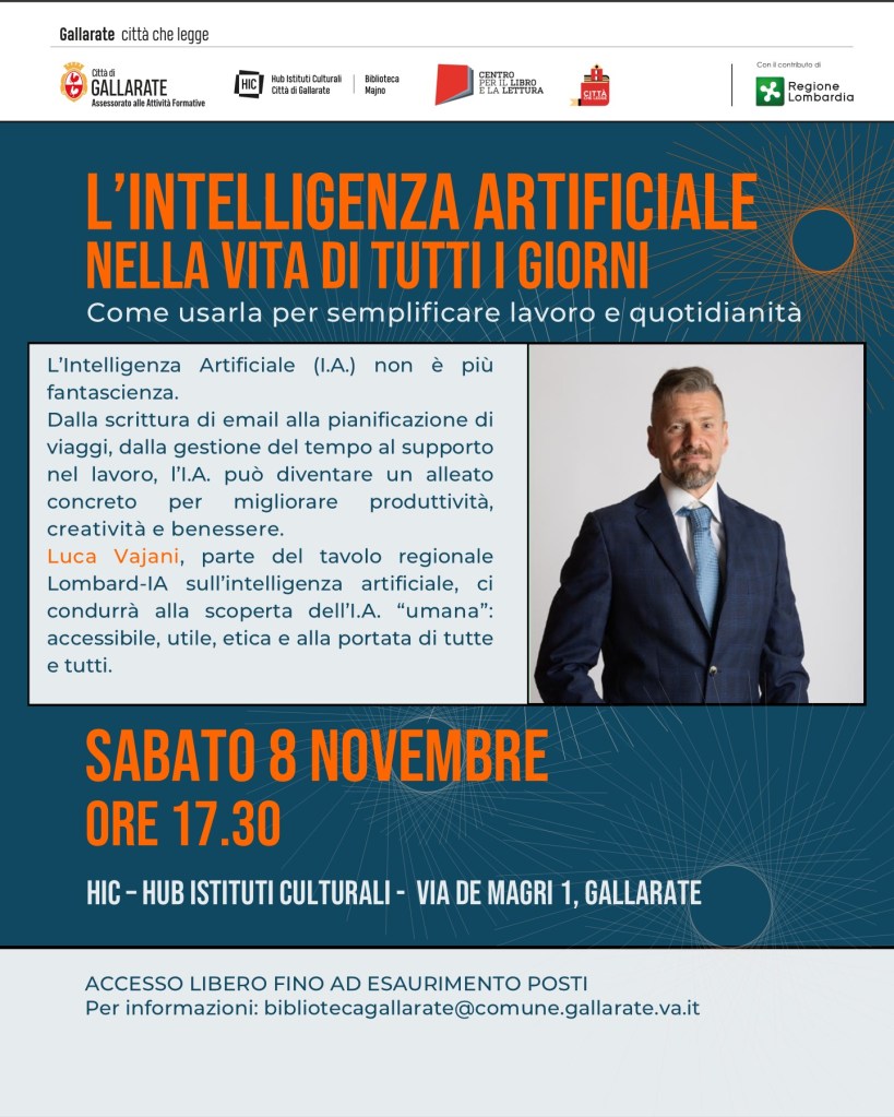 L’esperto Luca Vajani, membro del tavolo regionale Lombard-IA sull’intelligenza artificiale, guiderà il pubblico alla scoperta di un’I.A. “umana”: etica, comprensibile e alla portata di chiunque.