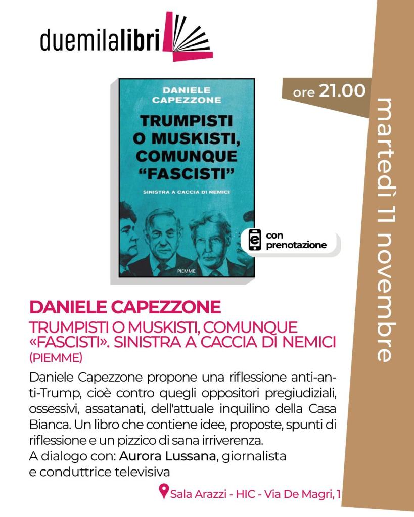 🕰️ Ore 21:00 – Daniele Capezzone presenta “Trumpisti o Muskisti, comunque ‘fascisti’. Sinistra a caccia di nemici” (Piemme)