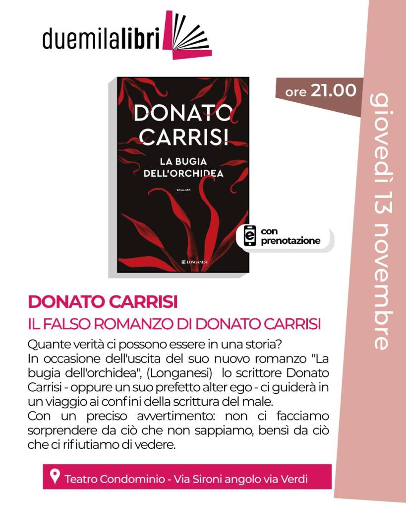 L’occasione è l’uscita del suo nuovo romanzo, “La bugia dell’orchidea” (Longanesi), ma quello che Carrisi porterà sul palco sarà qualcosa di più di una semplice presentazione: un viaggio ai confini della scrittura del male, dove l’autore e il suo “prefetto alter ego” si confondono in un intrigante gioco di verità e menzogne.