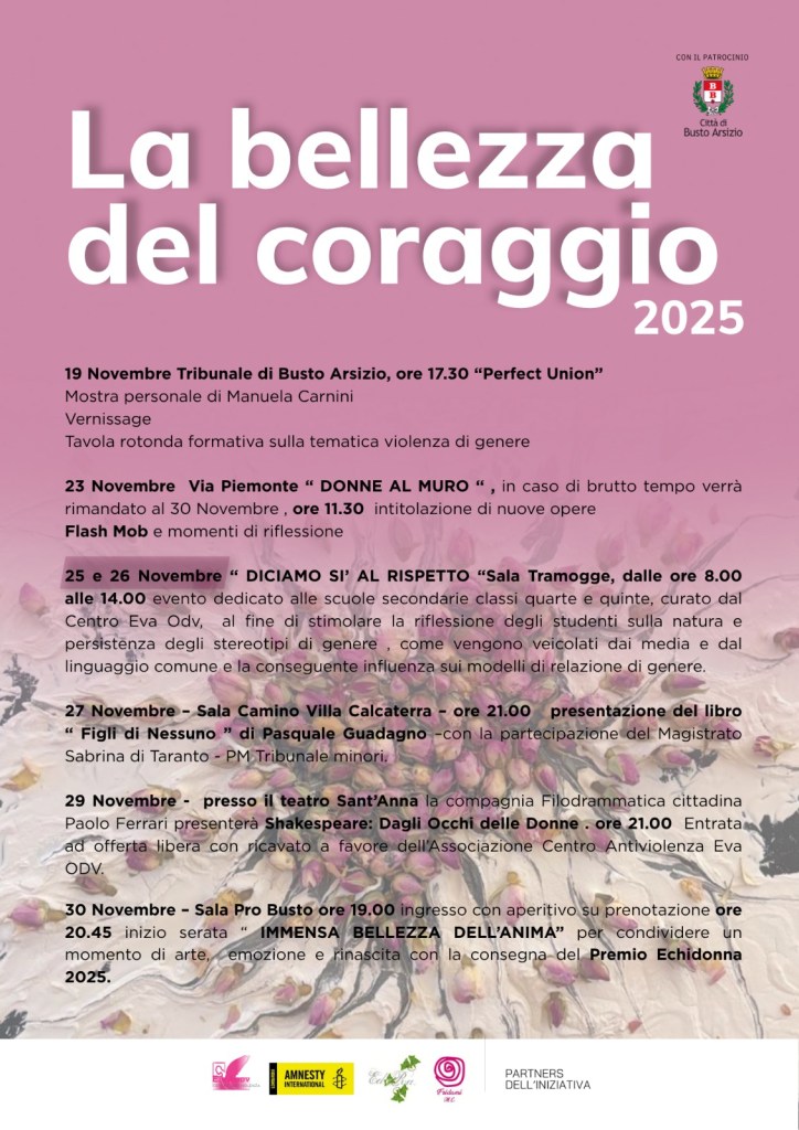 BUSTO ARSIZIO – Torna anche quest’anno La bellezza del coraggio, il calendario di appuntamenti che Busto Arsizio dedica alla sensibilizzazione contro la violenza di genere. Un percorso di arte, riflessione e comunità che dal 19 al 30 novembre 2025 coinvolgerà luoghi simbolici della città, scuole, associazioni e cittadini, con il patrocinio del Comune.