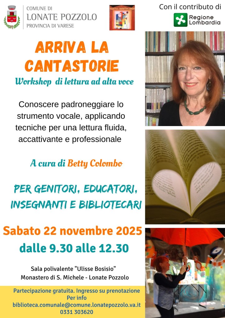 LONATE POZZOLO – Sabato 22 novembre 2025 Lonate Pozzolo accende i riflettori sulla voce – quella vera, quella che racconta, cattura, accompagna. Nella splendida cornice del Monastero di San Michele, la Sala Polivalente “Ulisse Bosisio” ospita “Arriva la Cantastorie”, un workshop di lettura ad alta voce pensato per genitori, insegnanti, educatori e bibliotecari… ma perfetto per chiunque voglia dare una marcia in più al proprio modo di leggere.