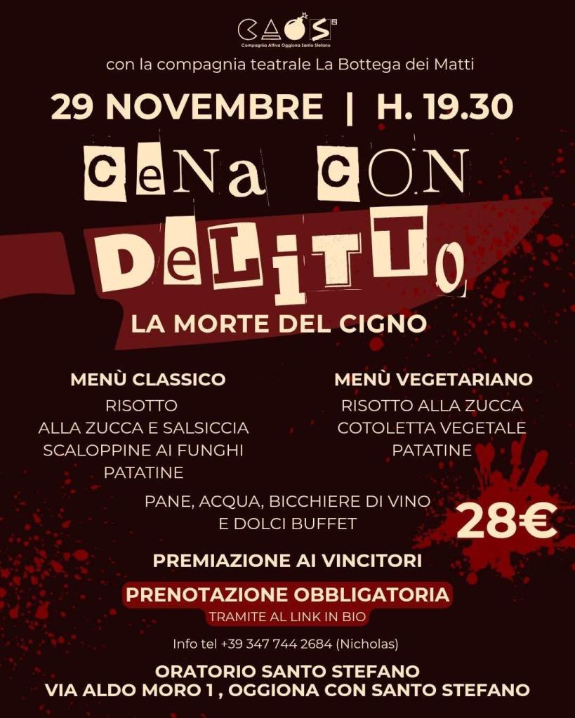 📣 Oggi è l’ultimo giorno per iscriversi alla cena con delitto organizzata da CAOS² – Compagnia Attiva Oggiona con Santo Stefano, in collaborazione con la compagnia teatrale La Bottega dei Matti.