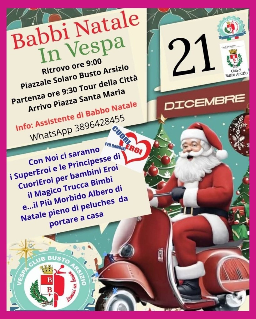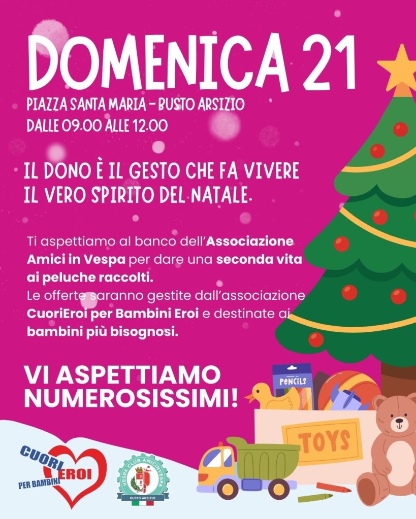BUSTO ARSIZIO – Natale, si sa, è il momento perfetto per rimettere in circolo un po’ di magia. E quest’anno, a Busto, la magia arriva… in Vespa. L’iniziativa del Vespa Club Busto Arsizio, in collaborazione con CuoriEroi NIDA Onlus, porta in città una tradizione che profuma di benzina vintage e buone azioni: una raccolta di peluche usati, pronti a una nuova vita tra le braccia di altri bambini.