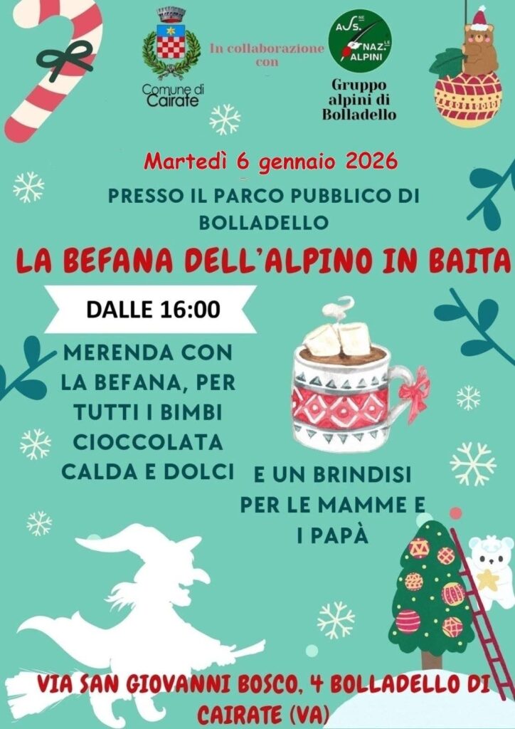 BOLLADELLO – A Bolladello di Cairate l’Epifania si festeggia nel segno della tradizione alpina, tra cioccolata calda, dolci e spirito di comunità. Martedì 6 gennaio 2026, dalle 16.00 alle 18.00, il Parco Pubblico di via San Giovanni Bosco ospita “La Befana dell’Alpino in Baita”, iniziativa organizzata dal Gruppo Alpini di Bolladello in collaborazione con il Comune di Cairate.