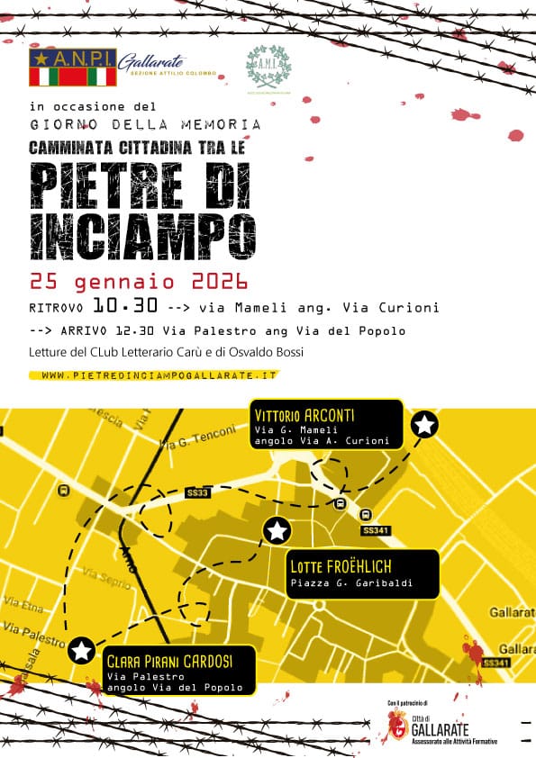 GALLARATE – In occasione del Giorno della Memoria 2026, ANPI e Associazione Mazziniana di Gallarate, con il patrocinio del Comune, invitano la cittadinanza a partecipare alla Camminata della Memoria, in programma domenica 25 gennaio, dalle 10.30 alle 12.30.