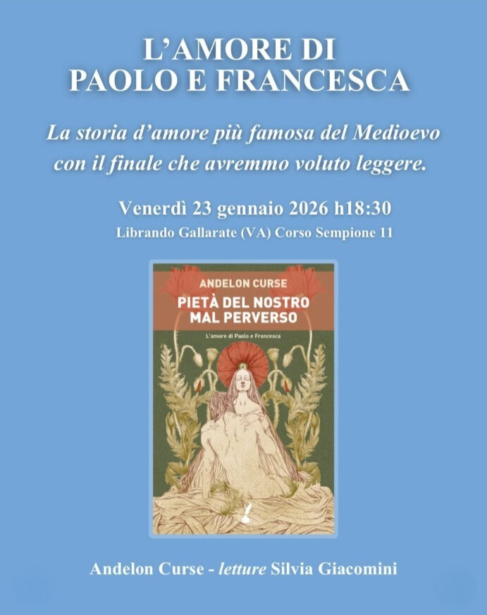 Protagonista della serata sarà Andelon Curse, che presenta Pietà del nostro mal perverso, un romanzo che riprende l’amore più famoso del Medioevo italiano e osa fare quello che per secoli nessuno ha voluto o potuto fare: immaginare un altro epilogo. Realtà o finzione? Dannati o fuggitivi? Domande che restano sospese, come il vento che trascina Paolo e Francesca nel canto di Dante, ma che qui trovano nuove strade narrative.