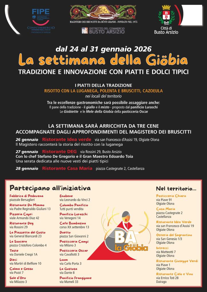 Dal 24 al 31 gennaio, Busto Arsizio si trasforma in una grande tavola diffusa grazie a “La settimana della Giöbia – tradizione e innovazione con piatti e dolci tipici”, iniziativa promossa da FIPE Busto Arsizio e Valle Olona, con il supporto del Magistero dei Bruscitti e la collaborazione dell’Amministrazione Comunale e del Duc.