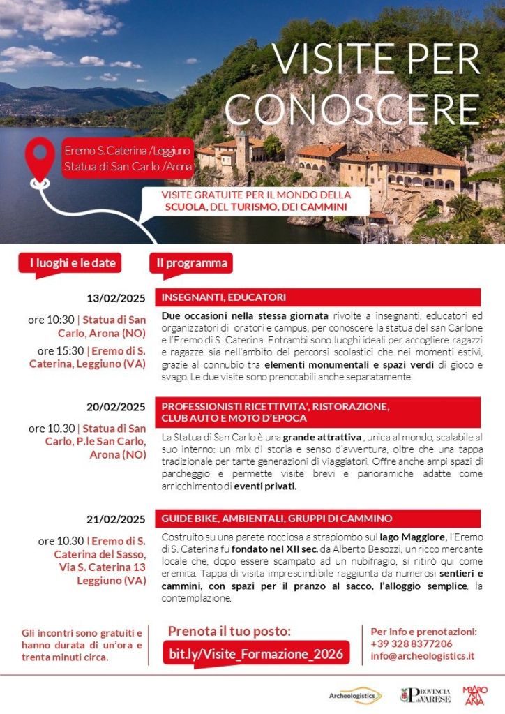 Nel febbraio 2026 San Carlone di Arona ed Eremo di Santa Caterina del Sasso aprono le porte a una serie di visite gratuite formative dedicate al mondo della scuola, del turismo e dei cammini, a cura di Archeologistics.