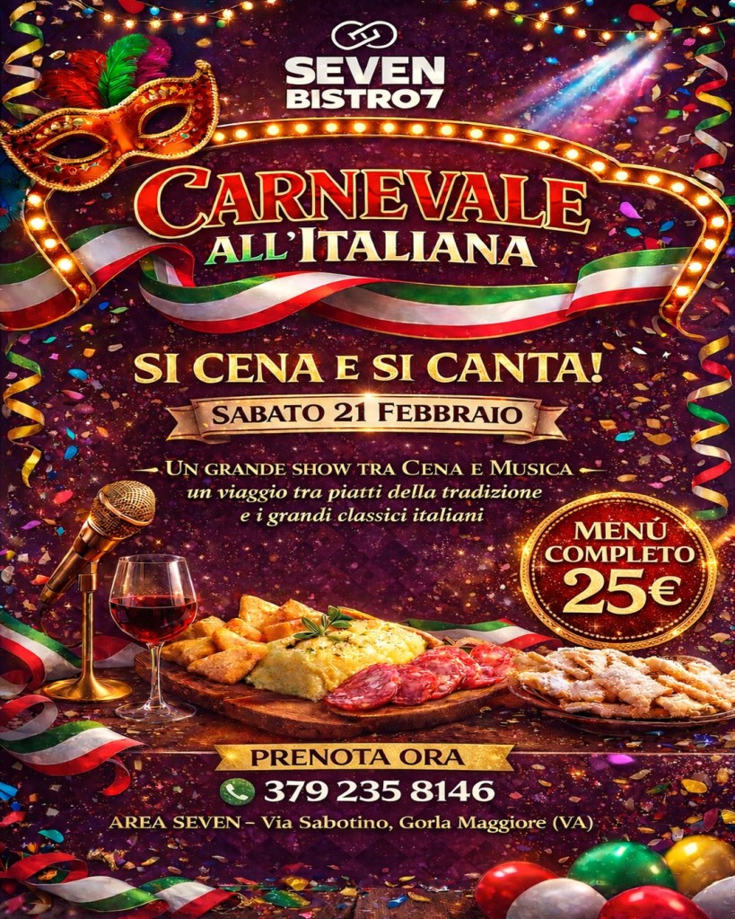 Un sabato sera dove il Carnevale prende la forma di una tavolata lunga, rumorosa e felice. “Carnevale all’italiana” è una cena-spettacolo che mescola cucina della tradizione e grandi classici della musica italiana, da cantare tutti insieme, microfono alla mano.