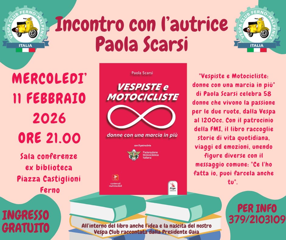Una serata dedicata alle donne che hanno scelto le due ruote come stile di vita, passione, lavoro, avventura. Mercoledì 11 febbraio il Vespa Club Ferno-Malpensa porta in Sala Conferenze il nuovo volume di Paola Scarsi: “Vespiste e Motocicliste: donne con una marcia in più”.