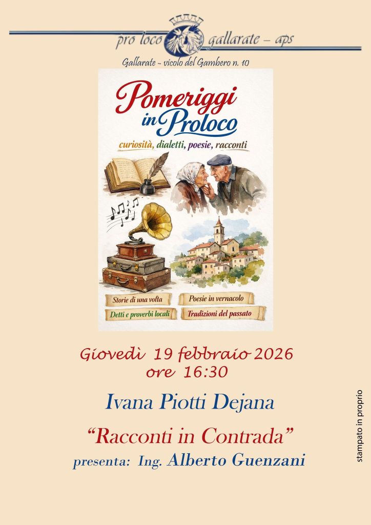 Giovedì 19 febbraio alle 16.30, nella sede della Pro Loco di Legnano in vicolo del Gambero, prende il via “Pomeriggi in Pro Loco”: un nuovo spazio di incontro pensato per i soci e aperto a tutta la cittadinanza di Gallarate.