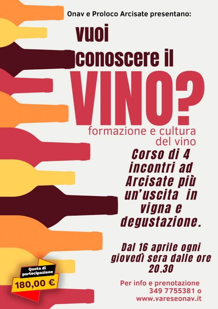 L’iniziativa è organizzata da ONAV – Organizzazione Nazionale Assaggiatori di Vino insieme alla Pro Loco Arcisate APS, con un percorso formativo che unisce teoria, degustazione e un’esperienza diretta in vigna.