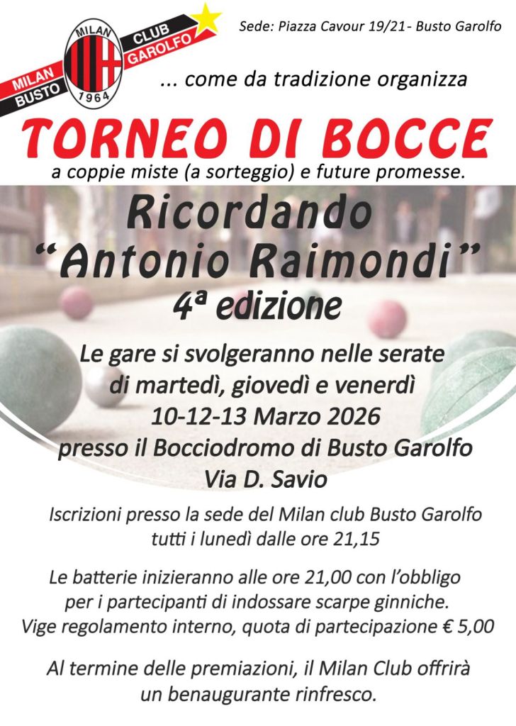 Da martedì 10 marzo prende il via il tradizionale torneo di bocce organizzato dal Milan Club Busto Garolfo, dedicato alla memoria di Antonio Raimondi, tra i soci fondatori del club.