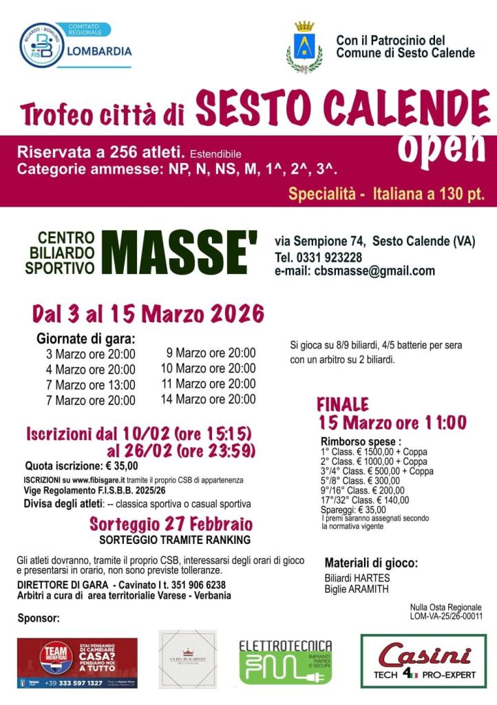 Proseguono per tutta la settimana le gare del Trofeo Città di Sesto Calende, torneo Open di biliardo iniziato il 3 marzo e ospitato al Centro Biliardo Sportivo Massé.