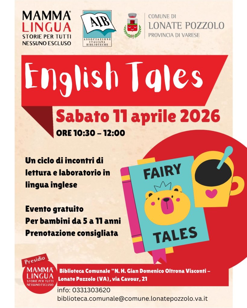 Sabato 11 aprile 2026, dalle 10:30 alle 12:00, la Biblioteca Comunale N. H. Gian Domenico Oltrona Visconti ospita un nuovo appuntamento di “English Tales”, parte del programma Mamma Lingua.