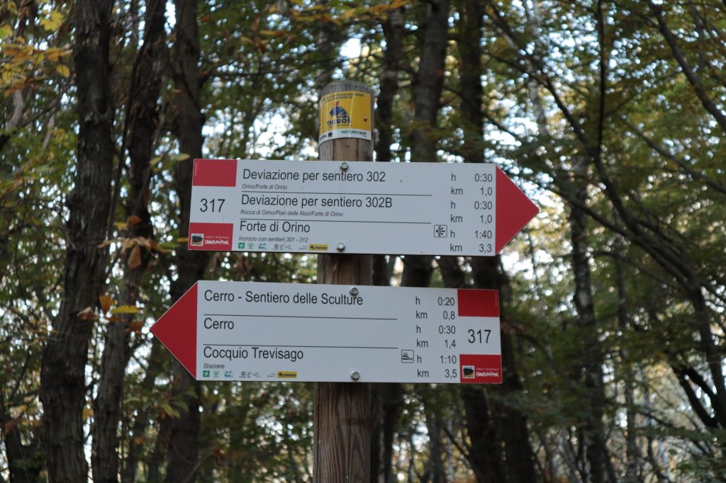 Si supera il bivio con il sentiero n. 310, in località Cavernago, e si prosegue nel fitto bosco sul versante destro della Valle Tacca. Continuando in salita verso nord, si oltrepassa la deviazione per la Grotta Remeron (visitabile con guide autorizzate) e, più in alto, si incontra l’Abisso della Scondurava. Poco sopra ci si immette sulla strada militare che, seguita verso sinistra appena sotto il crinale, conduce al Forte di Orino.