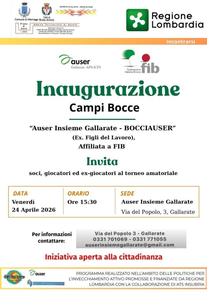 Venerdì 24 aprile si festeggia la riapertura dei campi da bocce di Auser Insieme Gallarate – “Bocciauser”, con un invito aperto a tutta la città: venite a giocare, guardare, o semplicemente stare.